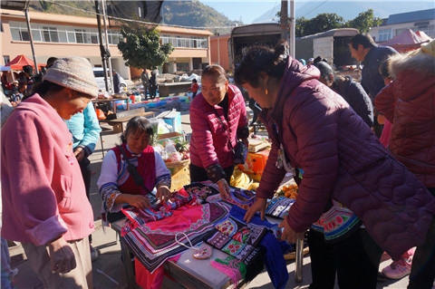 1月19日是太邑乡的街子天,太邑村委会清水沟自然村的李雪妹背着她绣好的彝族刺绣服装来赶街,她把小摊一摆出来,精美的服饰立即吸引人们前来观看、问价,不一会儿的功夫,她就卖出了上千元的刺绣服饰。李雪妹又去买了春联、蔬菜等年货,背上剩余的刺绣服饰回家了。