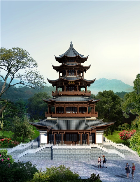3、翠华楼。楼名源于大理古国历史建筑。大理国王崇文尚武,注重修身养性、强身健体,因此在最南端迎着朝阳修建翠华楼,每天迎着朝阳吸纳太极之气,在此锻炼身体以固国本。翠华楼为干栏式五重檐楼阁建筑,全部用楠木打造,通高33.96米,是中国近代最高的全木结构建筑,共五层和三个结构夹(暗)层,上下有五层飞檐和三十八个如翼飞展的大翘角,伫立于近三米的高台之上,英姿挺拔,金碧辉煌,雄伟壮观。翠华楼第一层正面设演武台,为国王演武之所;二、三、四层为登高观光之台,登上高楼,近可通览园内全景,远可东观洱海日出,西赏苍峰晚霞,北俯城池商贾,南眺黎明炊烟;第五层为供奉文曲棂星之所,国王可在此晨纳朝阳之气,夜接星斗之光。楼体上下结构复杂,聚集了汉氏建筑和白族建筑的精髓,一、二层为翘昂斗拱,三层和演武台为垂柱花板式大挑斗拱,四层内梁栿直接出挑承抬屋面。五层为“象鼻吹莲”斗拱,“象”为佛教圣物,把象鼻吹莲斗拱用于顶层是表示对佛教的敬仰;楼层平面也富有变化,底层为四方形,二层转化为大四方小八角形,至三层变化为八角形,屋顶收于八角八面八脊,顶尖为圆形宝顶,以象征上圆下方,八面来风之意。