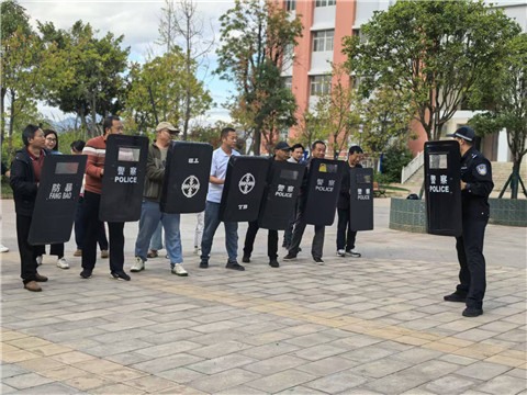 近日,大理市公安局凤仪派出所到辖区学校开展应急培训及实战演练。演练中,两名“歹徒”持械强行闯入校园,学校安保人员发现后立即启动应急预案,第一时间使用“校园一键报警”系统,各班教师迅速组织学生关闭门窗、躲避至安全区域,并按照规定路线有序撤离至安全地带。校园应急单元小组利用防暴器材与“歹徒”周旋,其他人迅速形成合围,果断采取战术动作将其制服并带离现场。