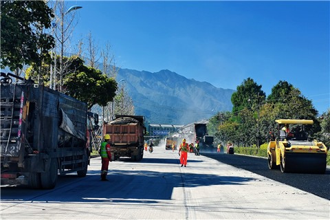 在景区段苍洱大道至学府路口路段施工现场,沥青摊铺机轰鸣向前,滚烫料体在熨平板下平整延展,工人修整边角、压路机跟进压实,保通人员疏导车流,收尾工作有序推进。
