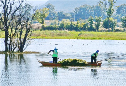 近期,冬季衰亡枯死水草等增多,为改善和稳定洱海水质,我市开展洱海流域衰亡水生植物清理。广大滩地管理员不惧风寒,认真进行枯死水草、漂浮物等打捞清理工作。 严镇威 摄